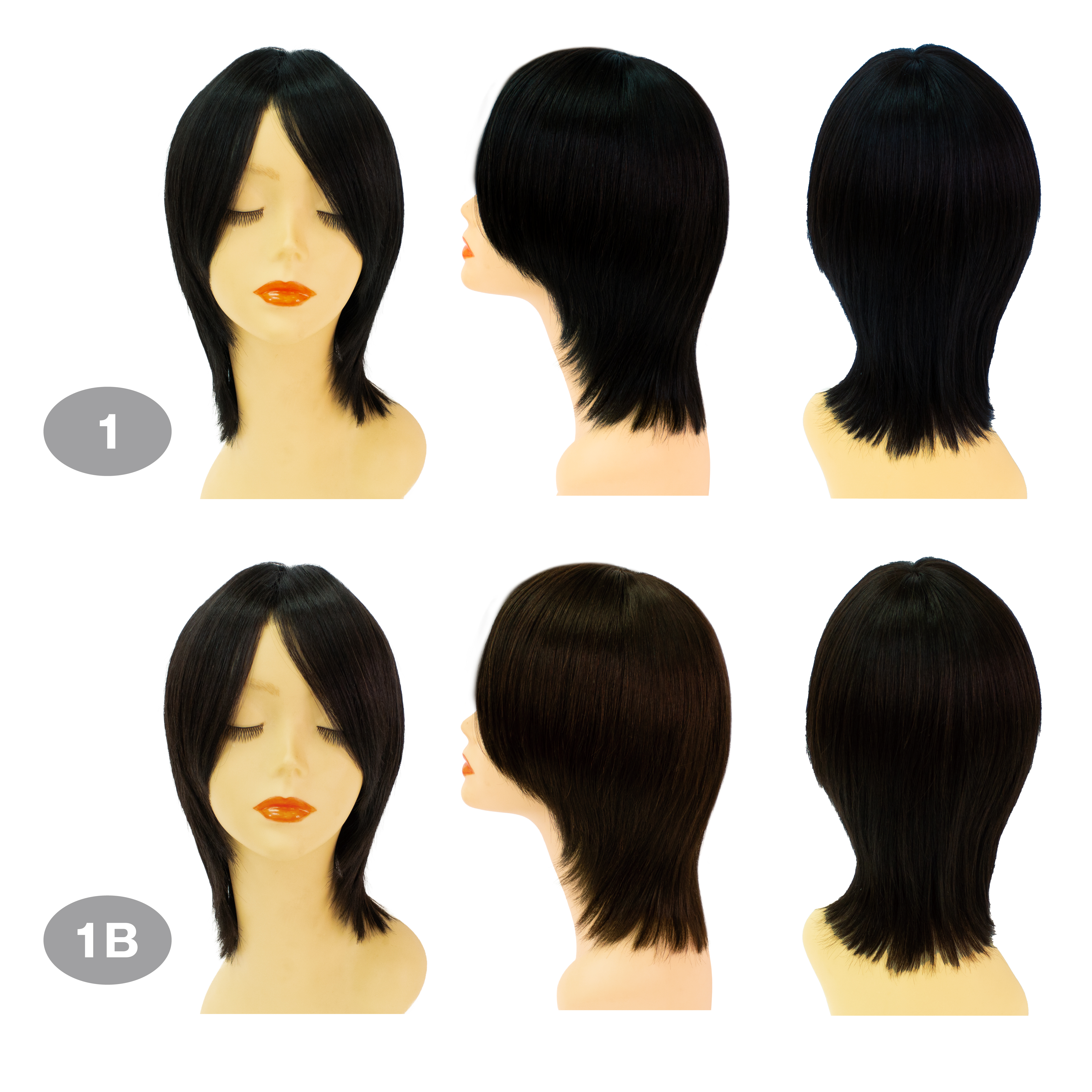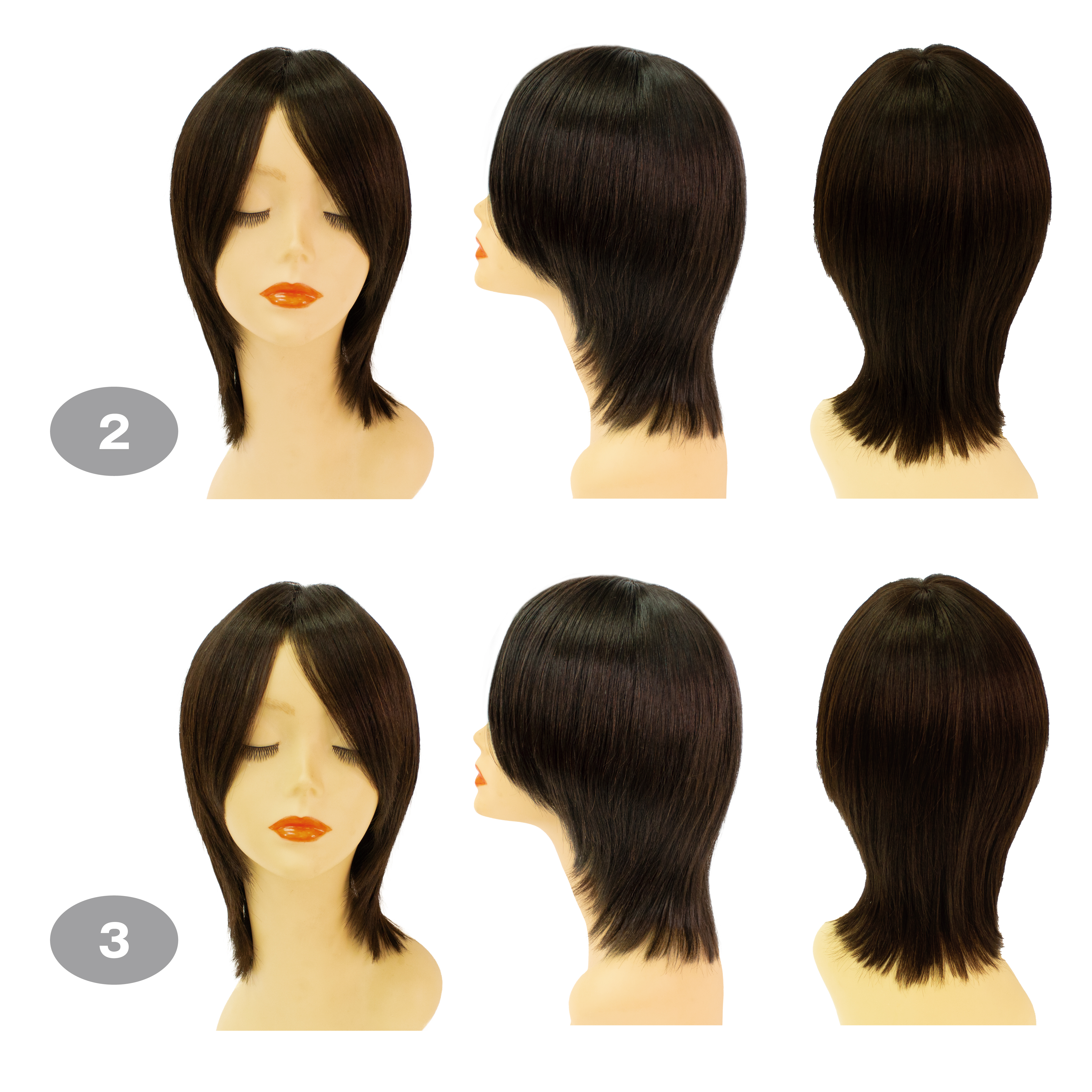 トップが短めの人毛ショート。前髪は鼻先まで、襟足は少し長め。ショートカットのアレンジに最適。